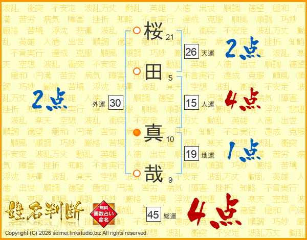 あなたの人生を表す1番重要な運勢です。生涯を通じて影響する総合運となり、主に50歳以降の晩年期に影響を及ぼします。苗字と名前の合計画数。