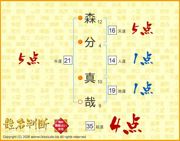 生活面を象徴する運勢です。外部から受ける影響力を表し、結婚運、家庭運や職場、環境への順応性を表します。総運から人運を引いた画数。姓や名が1文字の場合を除く。