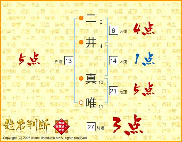 生活面を象徴する運勢です。外部から受ける影響力を表し、結婚運、家庭運や職場、環境への順応性を表します。総運から人運を引いた画数。姓や名が1文字の場合を除く。
