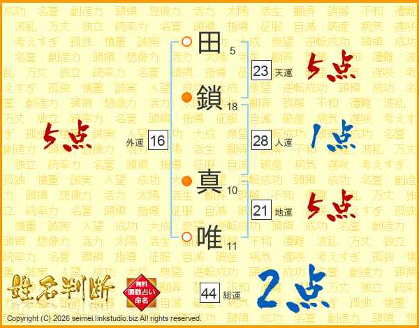 田(5画)鎖(18画) 真(10画)唯(11画)