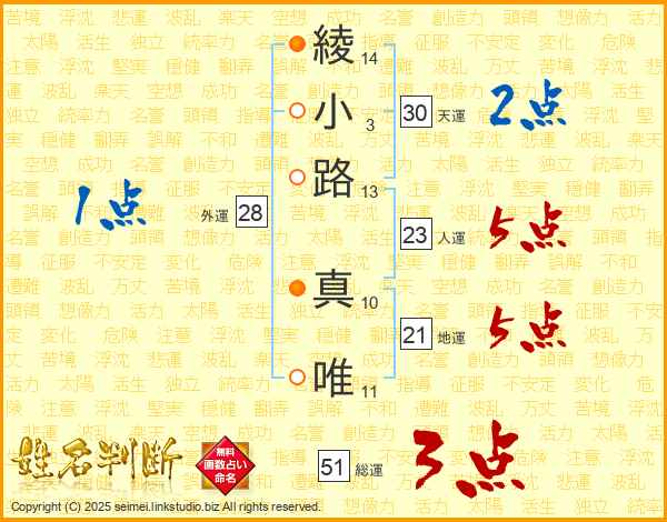 綾(14画)小(3画)路(13画) 真(10画)唯(11画)