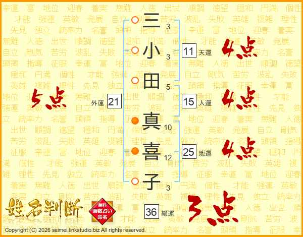 三(3画)小(3画)田(5画) 真(10画)喜(12画)子(3画)