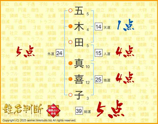 五(5画)木(4画)田(5画) 真(10画)喜(12画)子(3画)