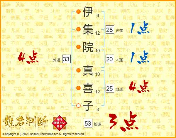 伊(6画)集(12画)院(10画) 真(10画)喜(12画)子(3画)