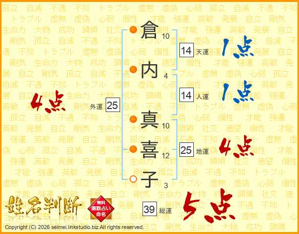 倉(10画)内(4画) 真(10画)喜(12画)子(3画)