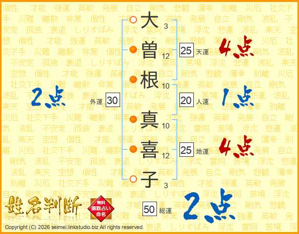 大(3画)曽(12画)根(10画) 真(10画)喜(12画)子(3画)