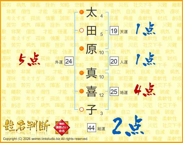 太(4画)田(5画)原(10画) 真(10画)喜(12画)子(3画)