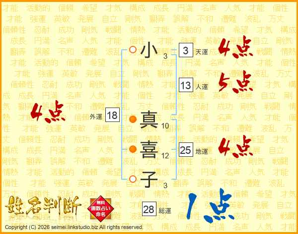 生活面を象徴する運勢です。外部から受ける影響力を表し、結婚運、家庭運や職場、環境への順応性を表します。総運から人運を引いた画数。姓や名が1文字の場合を除く。