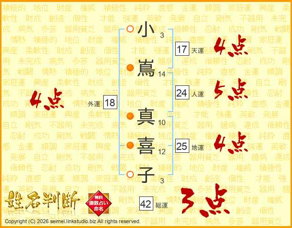 小(3画)嶌(14画) 真(10画)喜(12画)子(3画)