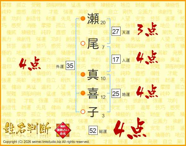 瀬(20画)尾(7画) 真(10画)喜(12画)子(3画)