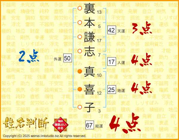 裏(13画)本(5画)謙(17画)志(7画) 真(10画)喜(12画)子(3画)
