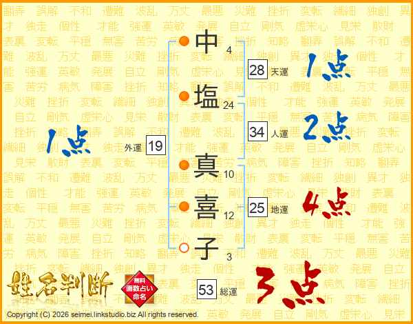 中(4画)塩(24画) 真(10画)喜(12画)子(3画)