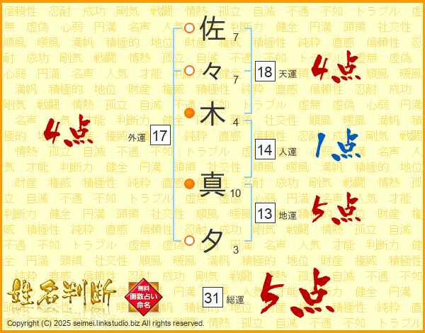 佐々木真夕さんの総運は31画の5点!