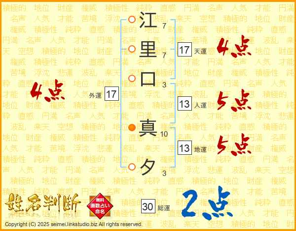 江(7画)里(7画)口(3画) 真(10画)夕(3画)