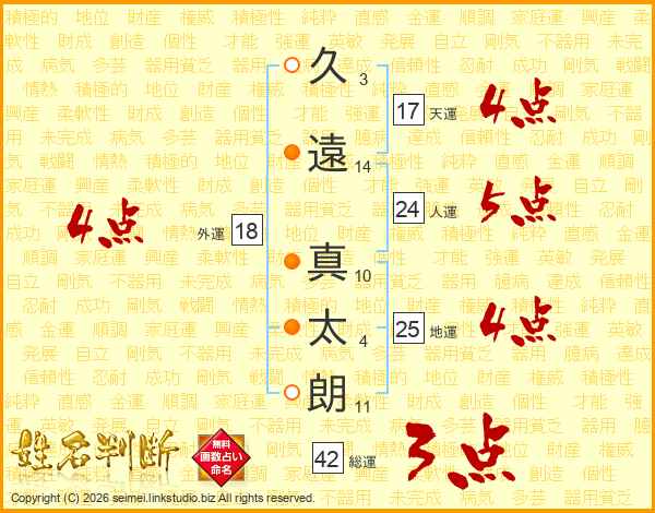 久(3画)遠(14画) 真(10画)太(4画)朗(11画)