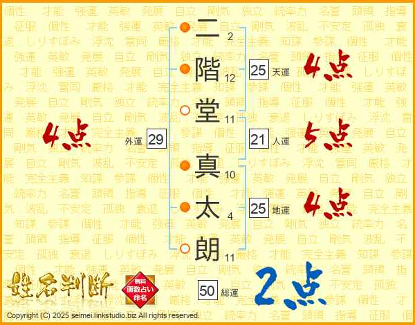 二(2画)階(12画)堂(11画) 真(10画)太(4画)朗(11画)