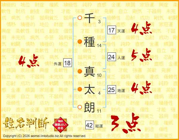 千(3画)種(14画) 真(10画)太(4画)朗(11画)