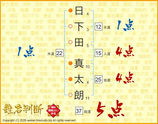 日(4画)下(3画)田(5画) 真(10画)太(4画)朗(11画)