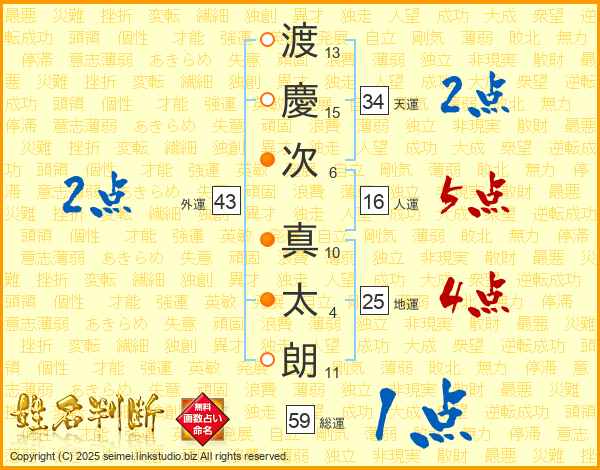 渡(13画)慶(15画)次(6画) 真(10画)太(4画)朗(11画)