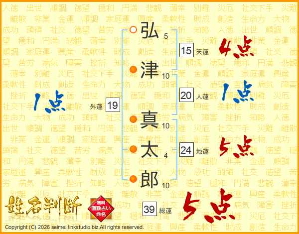 弘(5画)津(10画) 真(10画)太(4画)郎(10画)