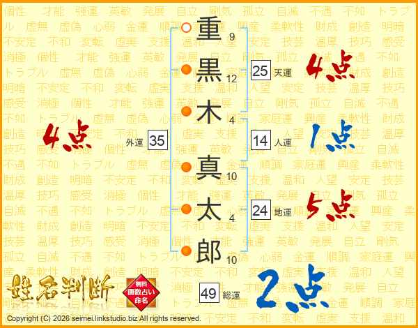 重(9画)黒(12画)木(4画) 真(10画)太(4画)郎(10画)