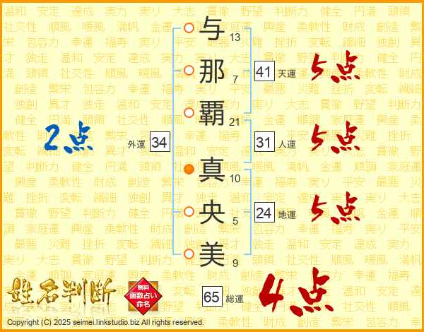 与(13画)那(7画)覇(21画) 真(10画)央(5画)美(9画)