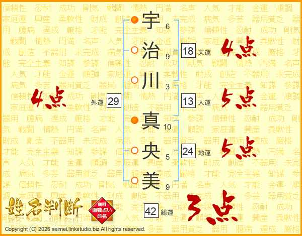 宇(6画)治(9画)川(3画) 真(10画)央(5画)美(9画)