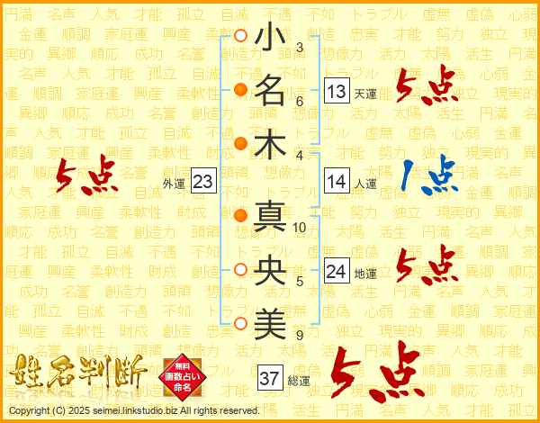 小(3画)名(6画)木(4画) 真(10画)央(5画)美(9画)