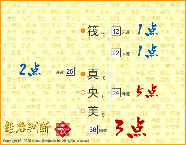 生活面を象徴する運勢です。外部から受ける影響力を表し、結婚運、家庭運や職場、環境への順応性を表します。総運から人運を引いた画数。姓や名が1文字の場合を除く。
