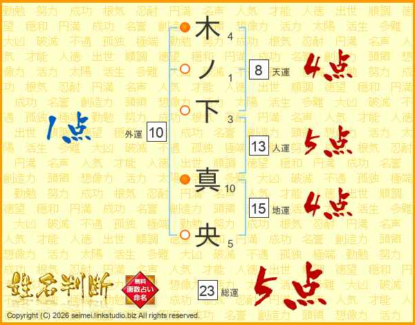 木ノ下真央さんの総運は23画の5点!
