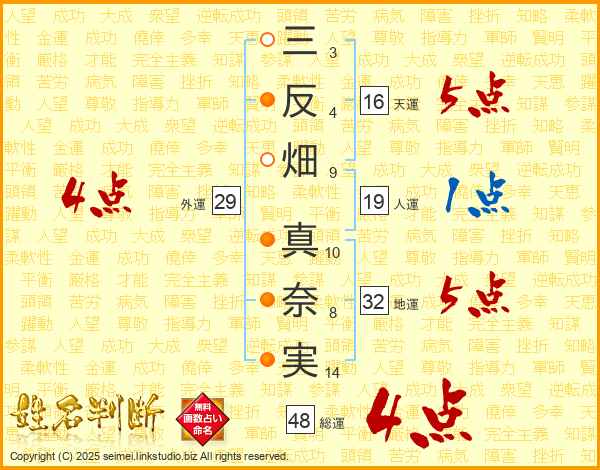 三(3画)反(4画)畑(9画) 真(10画)奈(8画)実(14画)