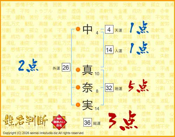 中(4画) 真(10画)奈(8画)実(14画)