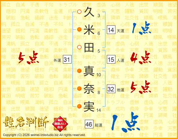久(3画)米(6画)田(5画) 真(10画)奈(8画)実(14画)