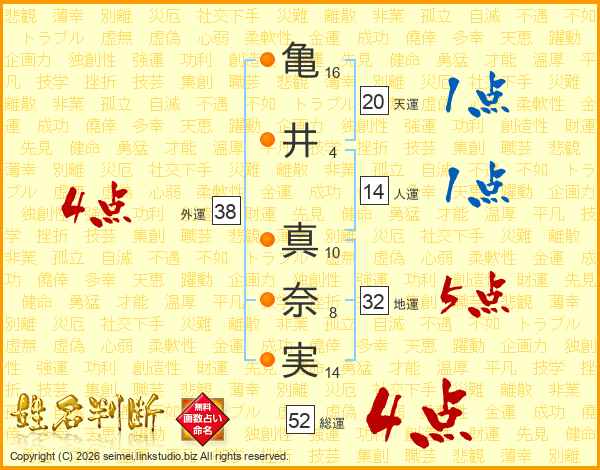 亀(16画)井(4画) 真(10画)奈(8画)実(14画)