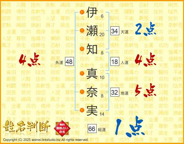 伊(6画)瀬(20画)知(8画) 真(10画)奈(8画)実(14画)