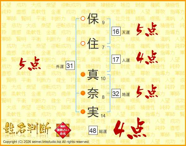 保(9画)住(7画) 真(10画)奈(8画)実(14画)