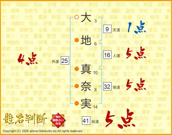 大(3画)地(6画) 真(10画)奈(8画)実(14画)