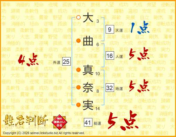 大(3画)曲(6画) 真(10画)奈(8画)実(14画)