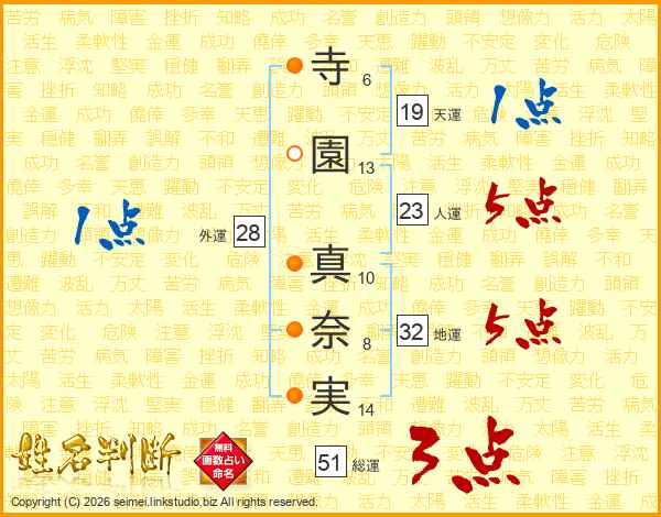 寺(6画)園(13画) 真(10画)奈(8画)実(14画)