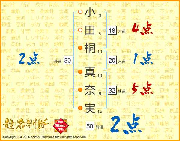 小(3画)田(5画)桐(10画) 真(10画)奈(8画)実(14画)