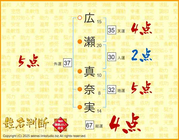広瀬真奈実さんの総運は67画の4点!
