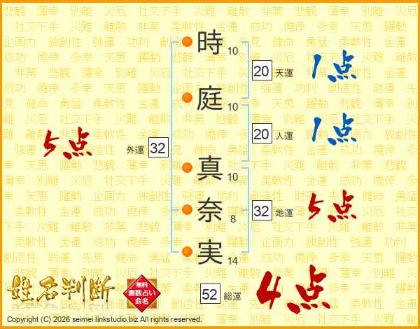 時(10画)庭(10画) 真(10画)奈(8画)実(14画)