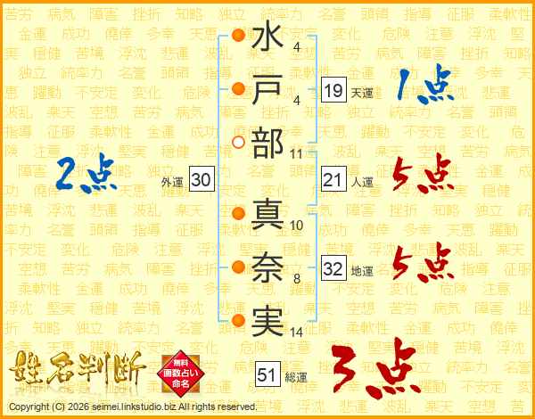 水(4画)戸(4画)部(11画) 真(10画)奈(8画)実(14画)