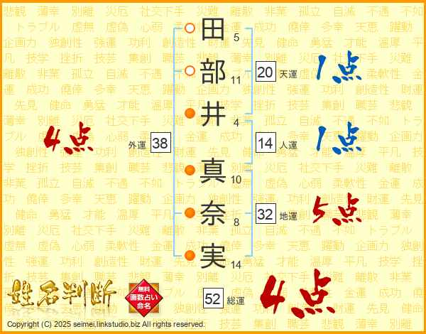 田(5画)部(11画)井(4画) 真(10画)奈(8画)実(14画)