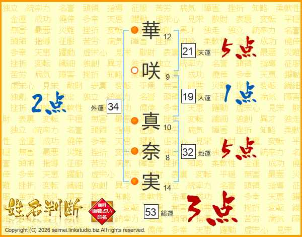 華(12画)咲(9画) 真(10画)奈(8画)実(14画)
