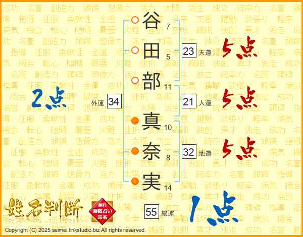 谷(7画)田(5画)部(11画) 真(10画)奈(8画)実(14画)