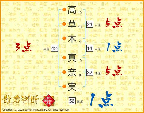 高(10画)草(10画)木(4画) 真(10画)奈(8画)実(14画)