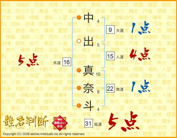 中出真奈斗さんの外運は16画の5点!