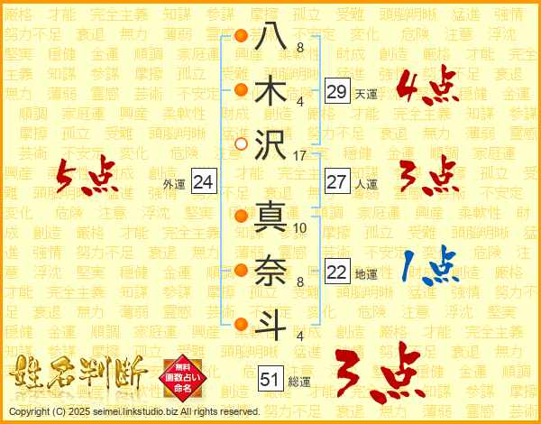 八(8画)木(4画)沢(17画) 真(10画)奈(8画)斗(4画)