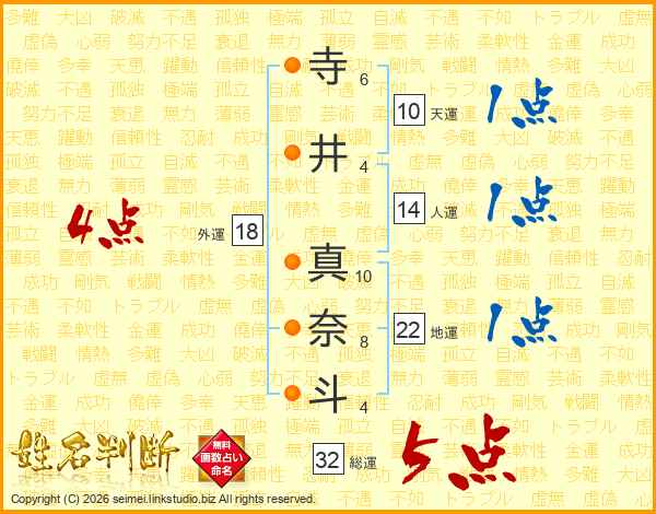 寺(6画)井(4画) 真(10画)奈(8画)斗(4画)